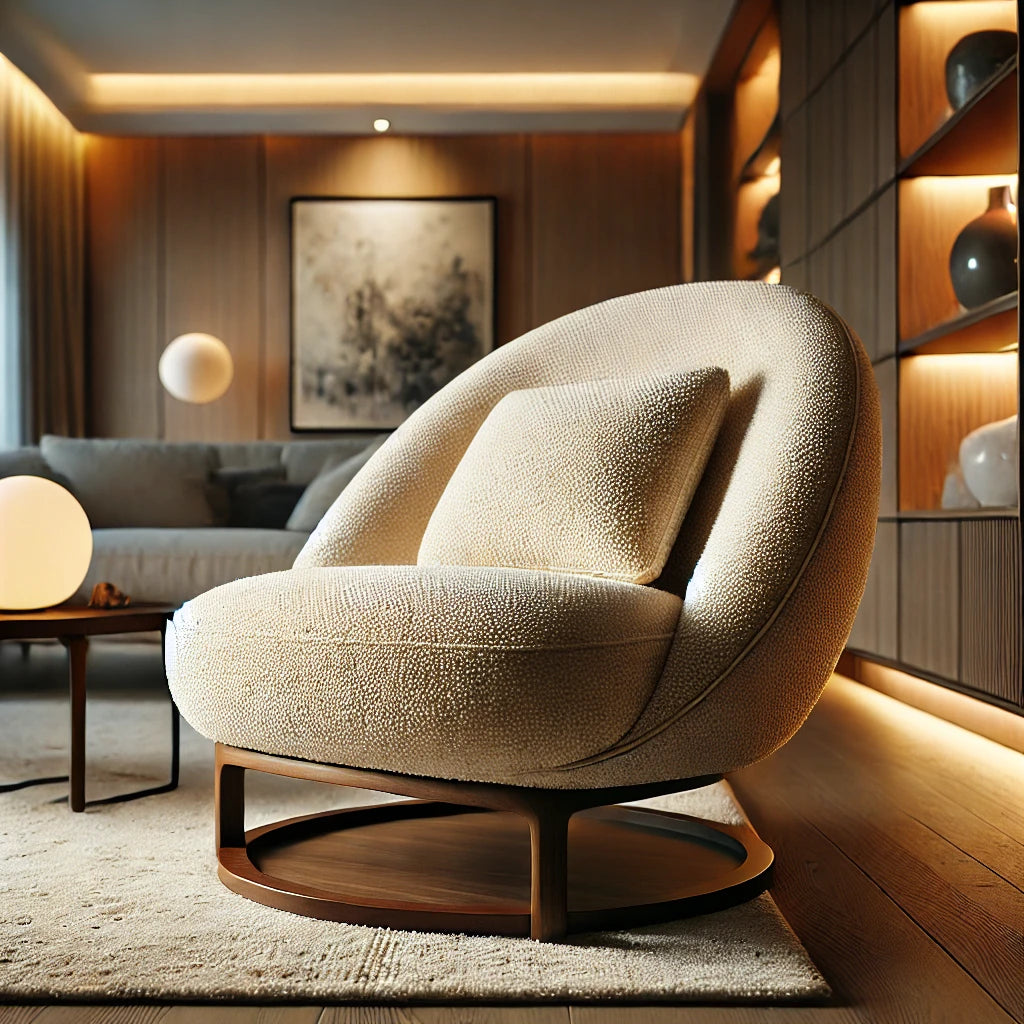 This cozy lounge chair with a rounded back and soft cream boucle upholstery brings warmth and style to any interior. Supported by a wooden base with a walnut finish, it offers a perfect balance of comfort and sophistication, making it an elegant choice for high-end spaces.