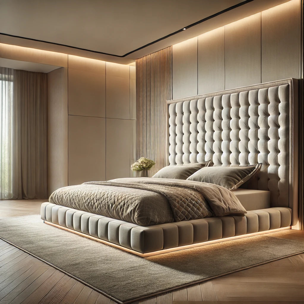 This luxurious bed, featuring a soft beige velvet tufted headboard and a low-profile frame, brings elegance and serenity to any bedroom. With its minimalist design and inviting, plush headboard, it’s crafted to offer both comfort and refined style, making it the perfect centerpiece for upscale interiors.